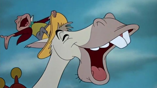 The first segment in this package film adapts Kenneth Grahame’s classic story “The Wind in the Willows” and is narrated by Basil Rathbone. The story follows the misadventures of one J. Thaddeus Toad (Eric Blore), a country squire who is spending his fortune on every fad he comes across. When we first meet him, he’s engaged in his latest mania: driving a gypsy cart across the countryside with his new friend, a Cockney-speaking horse named Cyril Proudbottom (J. Pat O’Malley) and together they are singing the insane “Merrily Song.”