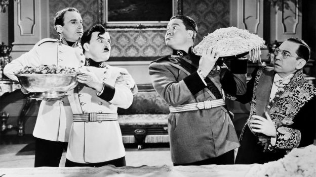 The film is a pretty straight parody of what was currently happening (or, more accurately, what was known to be happening) in Nazi Germany. Chaplin swore afterward that if he’d known the full extent of what was going on, the film would never have been made. The story is split between two polar opposite characters (both played by Chaplin): a nameless Jewish barber (who bears a suspicious resemblance to the famous Tramp of the silent era) and Adenoid Hynkel, the power-hungry dictator of Tomainia. Chaplin spent hours watching newsreel footage of Hitler giving speeches to nail his impression and it shows in the film’s opening speech. While the words are nonsense, the diction and pacing is straight out of something seen and heard in a Nazi propaganda film.