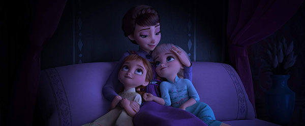 I’ve mentioned before that Frozen II is full of music, and it doesn’t take long for the songs to begin. Right at the very beginning of the film we get a song from Queen Iduna as she sings to the young Anna and Elsa (in a scene that is clearly set before the childhood accident that kicks off the events of Frozen). To help her daughters sleep, Iduna sings a song called “All is Found.”